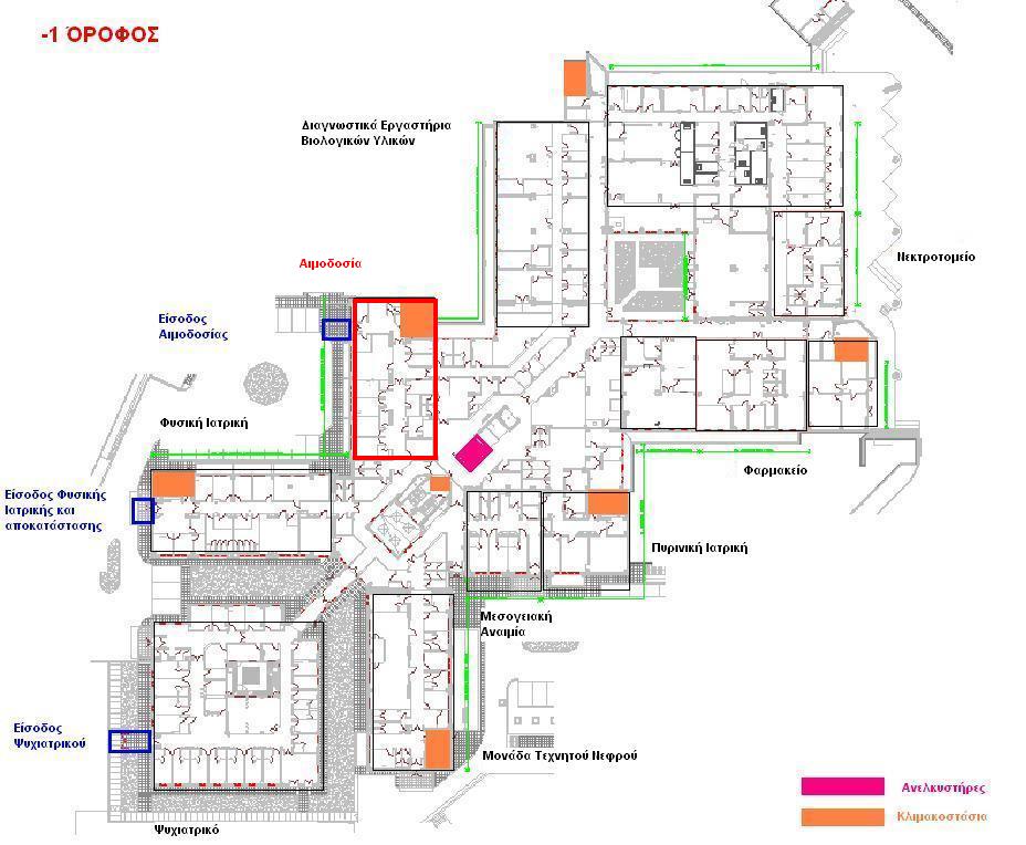 Η Υπηρεσία Αιμοδοσίας του Νοσοκομείου μας βρίσκεται στον όροφο -1 από την κεντρική είσοδο του Νοσοκομείου ή εκτός κτιρίου στην κάθοδο δεξιά από την κύρια είσοδο με δική της αυτόνομη είσοδο μόνο για αιμοδότες και με χώρο parking, με σκοπό την άμεση εξυπηρέτηση του αιμοδότη.