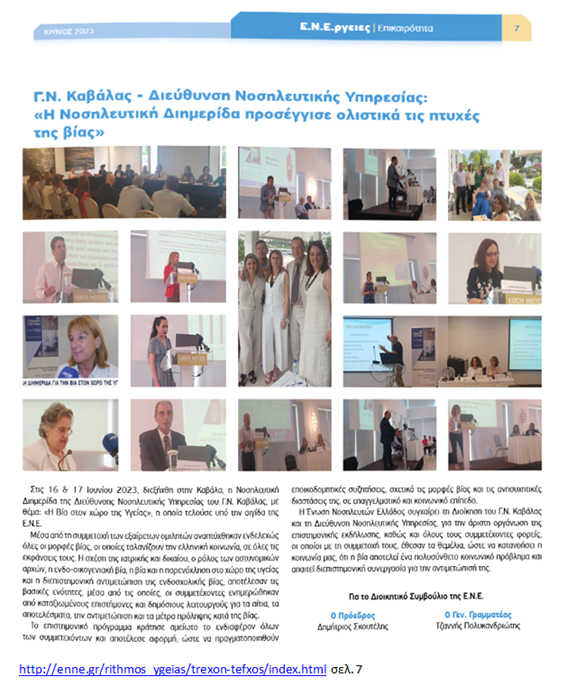 Με απόλυτη επιτυχία στέφθηκε η Διημερίδα με θέμα «Καταπολέμηση της Βίας και του εκφοβισμού. Βία στον χώρο της υγείας: Ενδοοικογενειακή, Παρενόχληση στον χώρο εργασίας, Ενδοσχολική, Ατομική ή κοινωνική ευθύνη;»» που πραγματοποίησε η Νοσηλευτική Υπηρεσία του Γενικού Νοσοκομείου Καβάλας σε συνεργασία με το Βία stop στο ξενοδοχείο Lucy Hotel στην Καβάλα την Παρασκευή 16 και το Σάββατο 17 Ιουνίου 2023. Η Διημερίδα τελούσε υπό την αιγίδα της Γενικής Γραμματείας Δημογραφικής και Οικογενειακής Πολιτικής και Ισότητας των Φύλων του Υπουργείου Εργασίας και Κοινωνικών Υποθέσεων, της 4ης ΥΠΕ, της Ένωσης Νοσηλευτών Ελλάδος με την αντίστοιχη παροχή Μονάδων Συνεχιζόμενης Νοσηλευτικής Εκπαίδευσης, ενώ τη διοργάνωση ανέλαβε η Περιφερειακή Ενότητα Καβάλας. Οι συμμετέχοντες ξεπέρασαν τους χίλιους (1062) από όλα τα μέρη της Ελλάδας.
