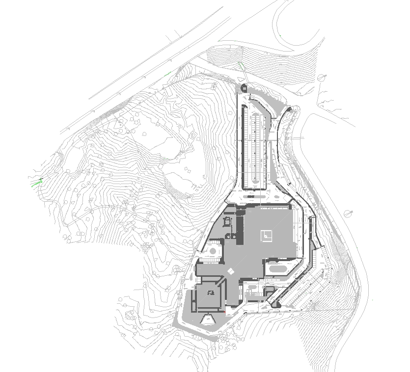 Το κτιριακό συγκρότημα αποτελείται από δύο κτίρια διαφορετικών υψών, συνδεδεμένα μεταξύ τους κεντρικά με ένα κτίριο που περιλαμβάνειτον κύριο κόμβο κατακόρυφων επικοινωνιών μέσω των ανελκυστήρων κοινού και προσωπικού. Το όλο συγκρότημα αναπτύσσεται εκατέρωθενδιαγωνίου (κατά 45ο) άξονα συμμετρίας. Με βάση την κλίση του οικοπέδου, το Νοσοκομείο είναι προσβάσιμο ισογείως σε δύο επίπεδα, στις στάθμες -1 και 0. Η στάθμη -2 είναι σε όλη της την επιφάνεια υπόγεια. Μεταξύ του Νοσοκομείου και των εισόδων δημιουργείται χώρος στάθμευσης 130 αυτοκινήτων, ενώ στο Ανατολικό τμήμα του οικοπέδου διαμορφώνεται και δεύτερο parking προσπελάσιμο από τον περιφερειακό δρόμο, 125 θέσεων. Οι θέσεις περιλαμβάνουν 9 θέσεις για ΑΜΕΑ.